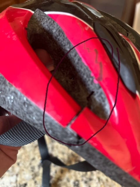 A big break — His bike helmet cracked from his forward fall onto the concrete. His forehead did not. Thank the Good Lord for that. And his mother.
